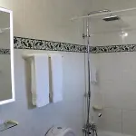 Der er et badeværelse, hvor en hårtørrer, badehånklæder og håndklæder er inkluderet.